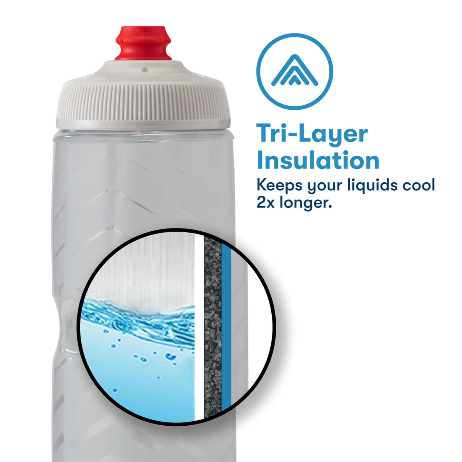 Diseñada para ciclistas de montaña, ciclistas de gravel y ciclistas de carretera para todo tipo de clima, la botella de agua Breakaway Muck Insulated cuenta con una tapa Muckguard™ que protege la válvula Surge™ de cualquier cosa que se presente en el camino. El Surge Cap de alto flujo proporciona un sorbo o un chorro de agua y se autosella para eliminar derrames y salpicaduras, incluso en los recorridos más accidentados. El aislamiento Tri-Layer™ y la tecnología reflectante del calor radiante mantienen tus líquidos frescos el doble de tiempo, para que puedas mantenerte fresco en días largos y polvorientos sobre el sillín. Disponible en tres tamaños, incluido un nuevo volumen de 12 oz, que se adapta a cualquier tamaño de cuadro y/o bicicleta de suspensión total con espacio limitado para botellas .
