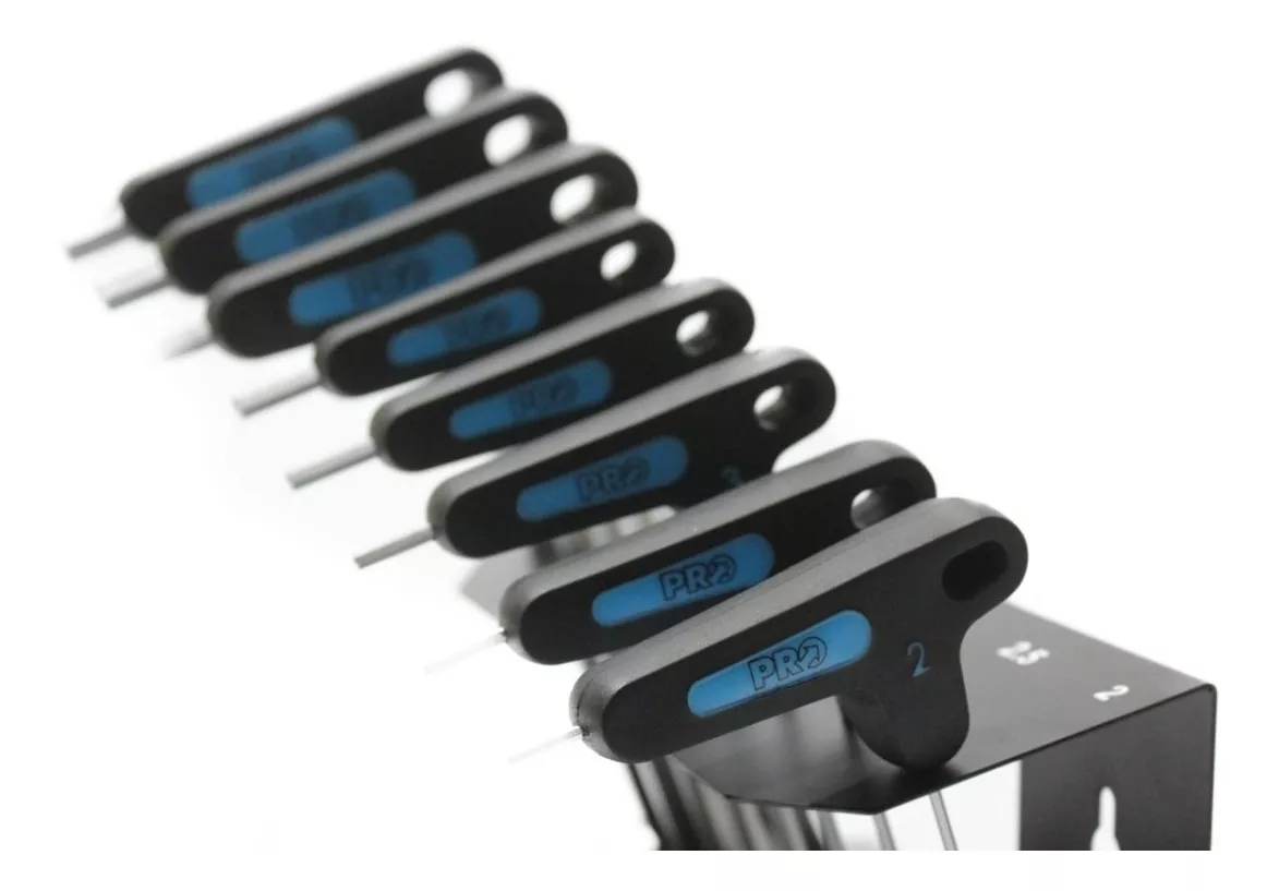 El Kit Llaves Allen PRO Tipo T 2/2,5/3/4/5/6/8/10mm es un conjunto de herramientas esenciales para cualquier ciclista. Fabricado en acero de alta calidad, este kit contiene 8 piezas de diferentes tamaños, desde 2mm hasta 10mm, lo que lo convierte en una herramienta versátil y útil para cualquier tipo de reparación o ajuste en tu bicicleta.