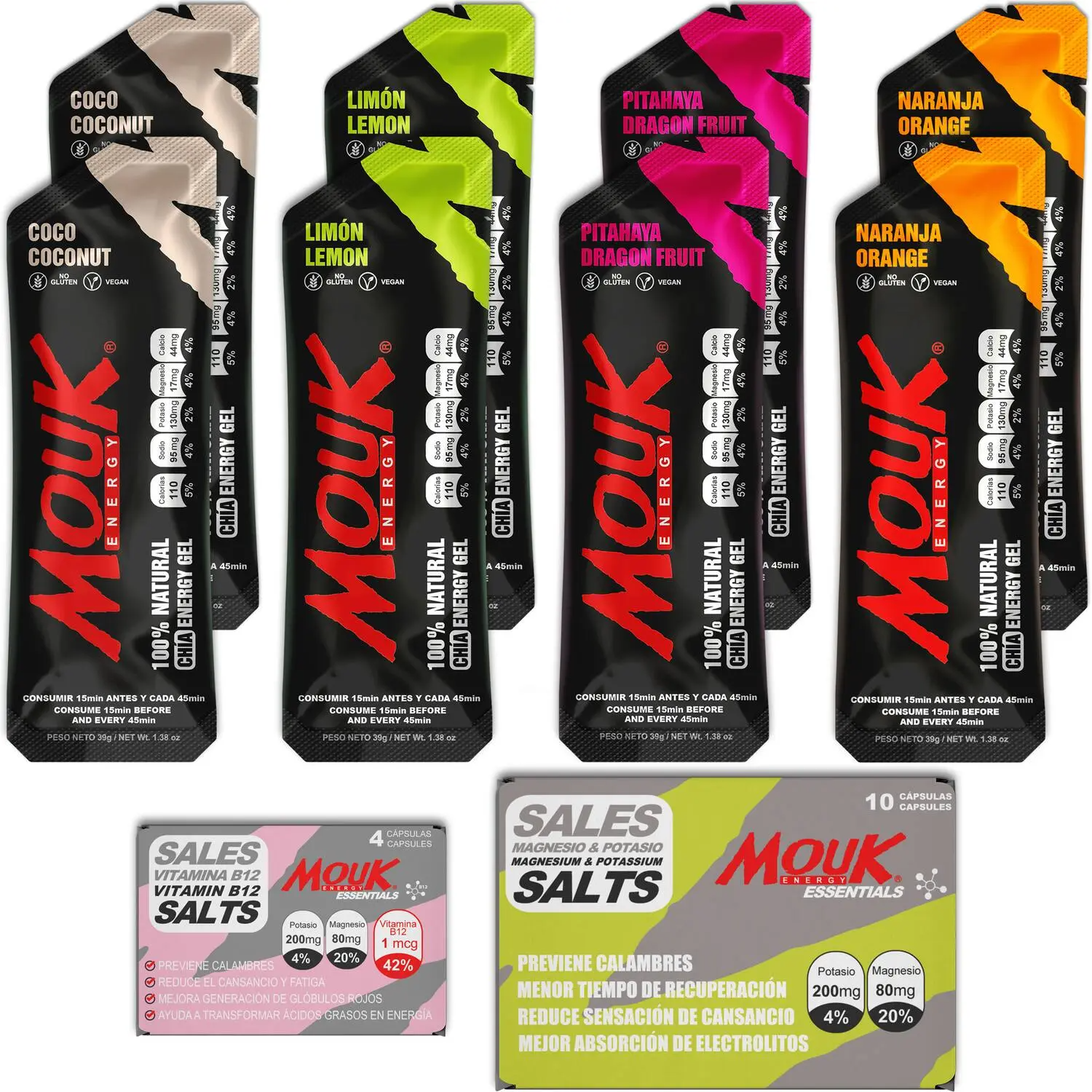 Kit Conquistadores: 8 Geles Energéticos Sabores Variados | 10 Cápsulas de Magnesio y Potasio | 4 Cápsulas de Magnesio y Potasio con Vitamina B12