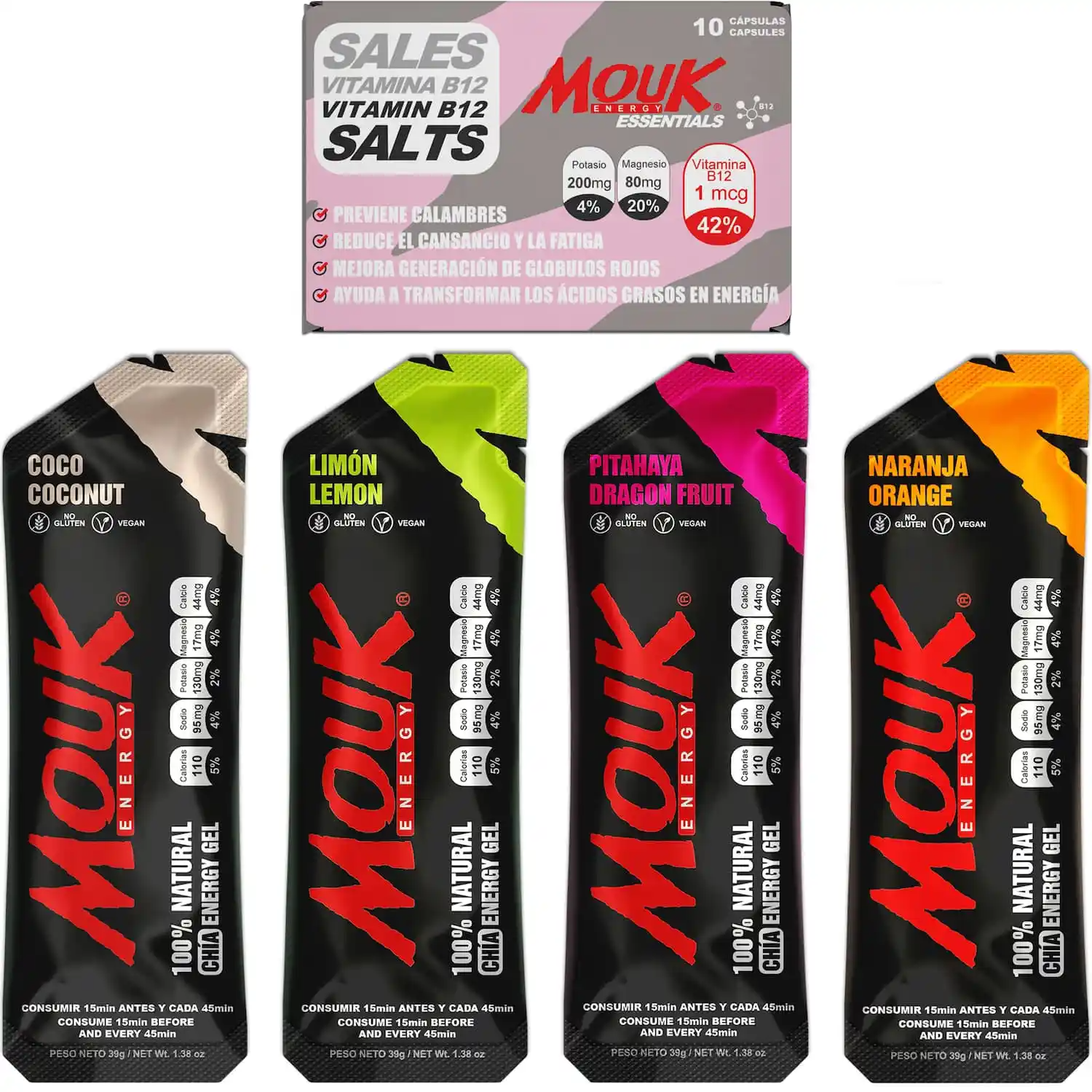MOUK ESSENTIALS B12 se encarga de mantener los niveles adecuados de Potasio (K), Magnesio (Mg) y Vitamina B12 durante los entrenamientos, competencias e inclusive en el día a día.