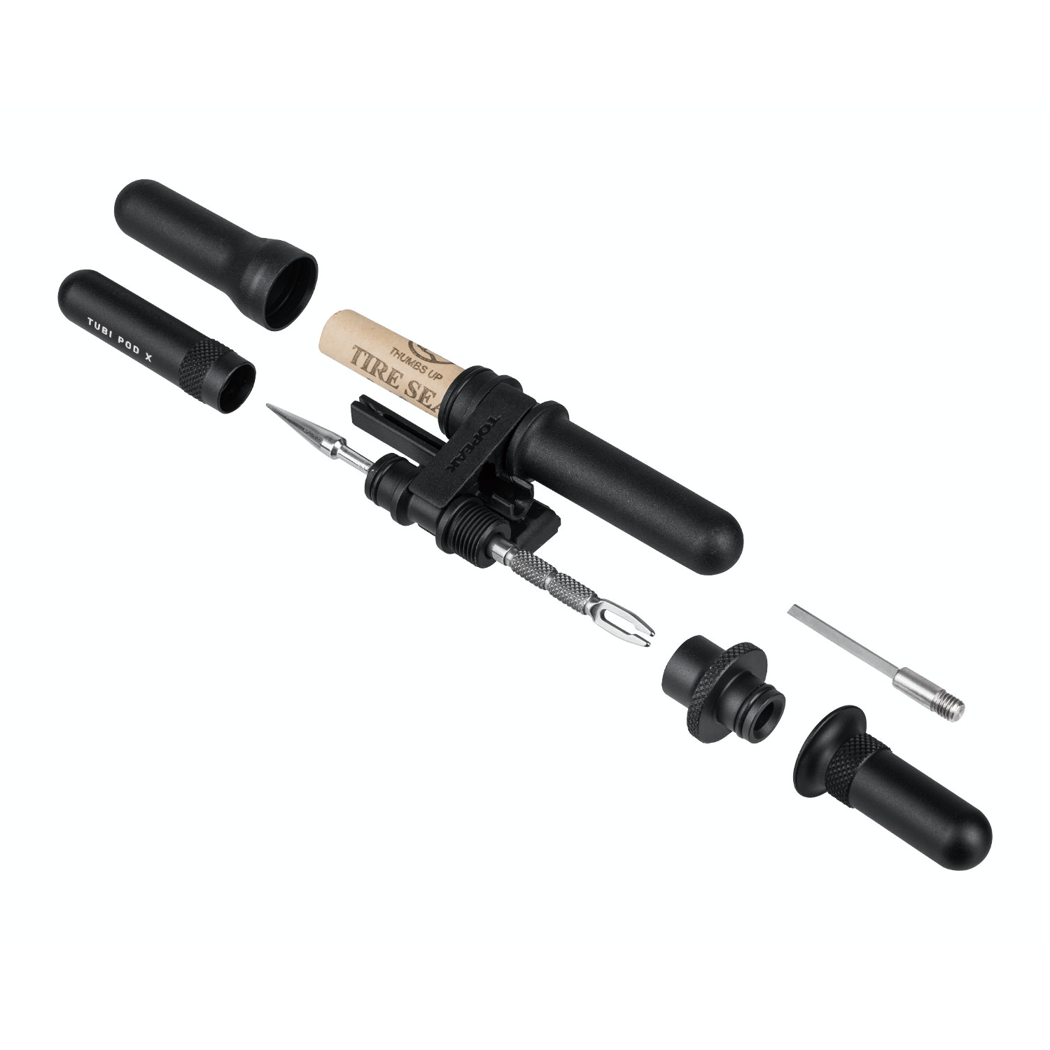 Un kit de reparación de neumáticos sin cámara compacto. Las herramientas de reparación sin cámara se guardan dentro de un compartimento mecanizado, mientras que los cinco tapones para neumáticos se guardan en un compartimento de polímero ligero. Ambos compartimentos se fijan a un módulo de montaje que se puede sujetar al tubo del cuadro o a la tija del sillín, listos y a la espera de la acción.
